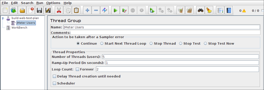 Next, you need to modify the default properties. Select the Thread Group element